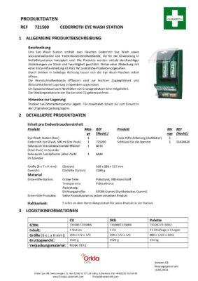 Eine Eye Wash Station enthält zwei Flaschen Cederroth Eye Wash sowie wasserabweisende und Textil-Wundschnellverbände, die für die Anwendung in Notfallsituationen konzipiert sind. Die Produkte werden mittels durchsichtiger Abdeckungen vor Staub und Feuchtigkeit geschützt. Hinter einer Abdeckung mit einer Erste-Hilfe-Anleitung ist Platz für zusätzliche Produkte vorgesehen. Durch Drehen in beliebige Richtung lassen sich die Eye Wash-Flaschen sofort öffnen.