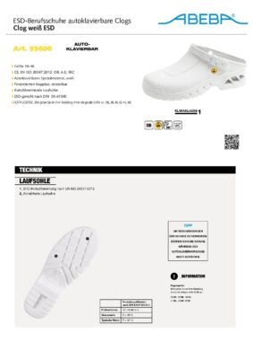 Der ESD-Clog Abeba 39600 ist die ultimative Lösung für hygienisch anspruchsvolle Arbeitsbereiche wie Labore, Krankenhäuser und die Pharmaindustrie. Gefertigt aus innovativem, autoklavierbarem Spezialmaterial, setzt dieser Berufsclog höchste Standards in Sachen Reinheit und Langlebigkeit. Dank der Zertifizierung nach EN ISO 20347:2012 (OB, A, E, SRC) bietet er nicht nur maximale Rutschhemmung auf glatten Böden, sondern schützt durch seine ESD-Gerechtheit nach DIN EN 61340 auch zuverlässig vor elektrostatischen Entladungen.