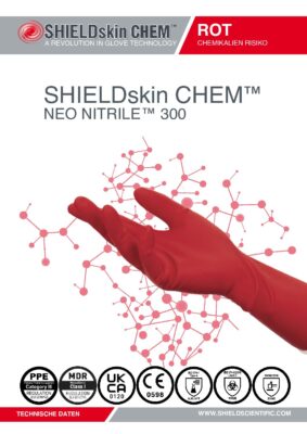 Der unsterile Chemikalienschutzhandschuh SHIELDskin CHEM™ NEO NITRILE™ 300 aus Neopren/Nitril bietet einen exzellenten Schutz vor Chemikalien im Labor.