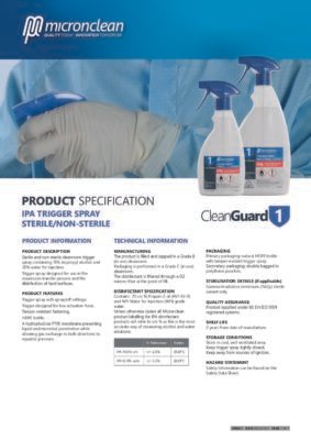 Unsteriles Desinfektionsmittel CleanGuard 1 IPA mit 70 % Isopropylalkohol und 30 % Wasser für Injektionszwecke. Wahlweise als 950 ml Sprühflasache oder als gebrauchsfertiger 5 Liter Kanister. Die Sprühflasche ist ideal für den Einsatz im Reinraumtransferprozess und innerhalb von Isolatoren / Lafs sowie zur Desinfektion harter Oberflächen, der Kanister für größere, harte Oberflächen.