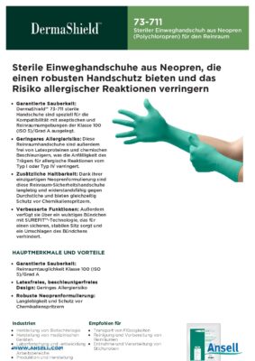 Der Neopren-Handschuh DermaShield 73-711 von Ansell bietet zu wettbewerbsfähigen Preisen den Tragekomfort und die Flexibilität von Naturgummilatex: Seine Neoprenformulation zeichnet sich aber zusätzlich durch besseren Chemikalienschutz aus. Der neue Rollrand verhindert das Abrutschen der Handschuhstulpe und erhöht damit noch die Schutzwirkung.