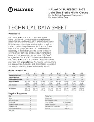 PUREZERO HG3 Sterile hellblaue Nitril-Reinraumhandschuhe haben eine handtypische Form, eine Dicke von 4 Millimeter an den Fingerspitzen und eine Länge von ca. 30 cm mit einer glatten Oberfläche, einer Stulpe mit Rollrand, um das Anziehen zu erleichtern und ein Herunterrollen zu verhindern, sowie strukturierte Fingerspitzen und Handflächen. Mit Gammabestrahlung bis zu einem Sterilitätssicherungsgrad (SAL) von 10-6 sind sie für aseptische Reinraumanwendungen geeignet.