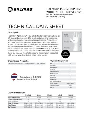 HALYARD PUREZERO HG5 weiße Nitril-Reinraumhandschuhe sind 300 mm lang und für die Herstellung von Halbleitern, pharmazeutischen und medizinischen Geräten konzipiert. Diese Handschuhe sind sauber verarbeitet (wiederholt in deionisiertem Wasser gewaschen), um eine gleichbleibende Kontrolle von geringen Partikeln und extrahierbaren Stoffen zu gewährleisten, und werden für den Einsatz in Reinräumen der ISO-Klasse 5 oder höher und der Klassen B/C/D empfohlen. Da HALYARD PUREZERO HG5 weiße Nitril-Reinraumhandschuhe eine beschleunigerfreie Formulierung besitzen, besteht ein geringeres Risiko von Allergien und Hautreizungen, die mit Beschleunigerchemikalien in anderen Nitrilhandschuhen verbunden sind.
