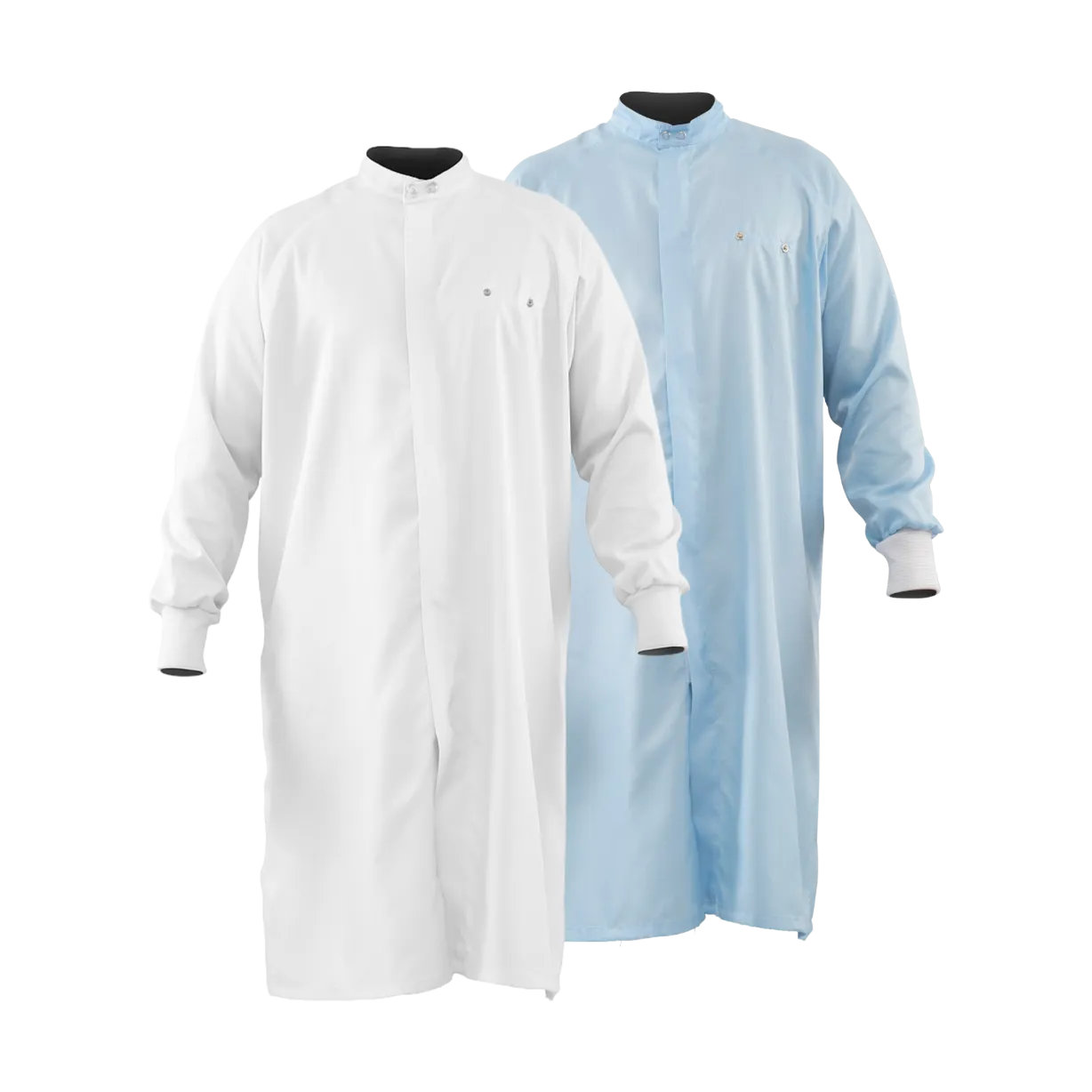 Waschbarer Reinraum-Kittel Alsistrong, wahlweise in den Farben Weiß oder Hellblau – andere Farben auf Anfrage.