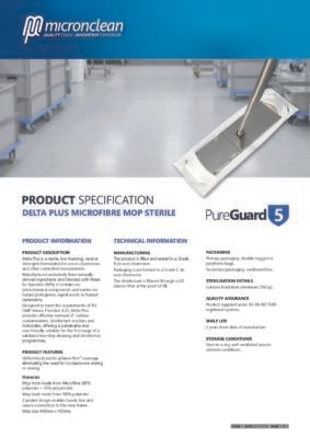 Weißer steriler Einweg-Mikrofasermopp, vorgetränkt mit Delta Plus (Neutralreinigungsmittel bestehend aus natürlichen Inhaltsstoffen gemischt mit Wasser für Injektionszwecke (WFI)). Delta Plus wurde für die effektive Entfernung von Oberflächenverunreinigungen, Desinfektionsmittelrückständen und Keimbelag entwickelt und bietet damit eine nachhaltige und benutzerfreundliche Lösung für die erste Stufe eines validierten zweistufigen Reinigungs- und Desinfektionsprogramms.. Gleichmäßig dosiert für eine Reinigungsfläche von 15 m², wodurch das Dosieren oder Mischen im Reinraum entfällt.
