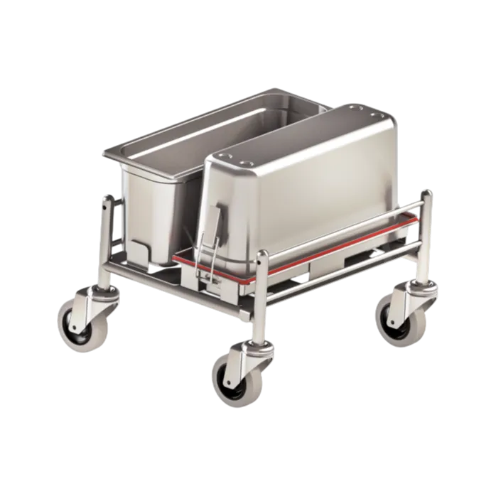 Kleiner Reinigungswagen Clino CR mini EM-GMP1 mit Vorpräparationsmethode EasyMop GMP und Entsorgung für hochsensible Bereiche aus Edelstahl.