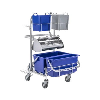 Reinigungswagen Clino CR1 EM-CR mit Vorpräparationsmethode EasyMop CR und Entsorgung für nicht-sterile Bereiche aus Edelstahl und Kunststoff.
