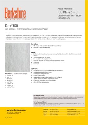 Das Vliestuch Durx 670 von Berkshire ist ein Reinraumtuch aus Zellulose/Polyester, das für Umgebungen der ISO-Klasse 5 und höher empfohlen wird. Die Kombination von Eigenschaften verleiht dem Durx 670 Vliestuch die Saugfähigkeit, Abriebfestigkeit und chemische Verträglichkeit, die für kontrollierte Umgebungen und Anwendungen erforderlich sind, bei denen sowohl Sauberkeit als auch Wirtschaftlichkeit von größter Bedeutung sind.