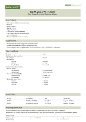 Das Gem-Wipe W-PC689 ist ein saugfähiges, unsteriles Reinraum-Tuch aus Polyester/Zellulose. Getränkte und sterile Ausführungen sind ebenfalls erhältlich.