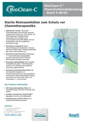 - Gesicherter Barriereschutz: BioClean-C Chemotherapie-Ärmelschoner wurden nach den ASTM F739-12-Permeationsstandards getestet.
