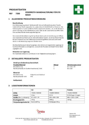 Eine Halterung aus grünem Hartkunststoff, die zur Aufbewahrung einer Flasche Cederroth Eye Wash vorgesehen ist, sodass diese im Notfall leicht zu finden ist. Die Halterung kann an jeder vertikalen Fläche angebracht werden, z. B. an der Wand, in einem Fahrzeug, an der Werkbank im Labor oder an der Cederroth Erste-Hilfe-Tafel. Eine nachleuchtende Anleitungstafel liegt bei.